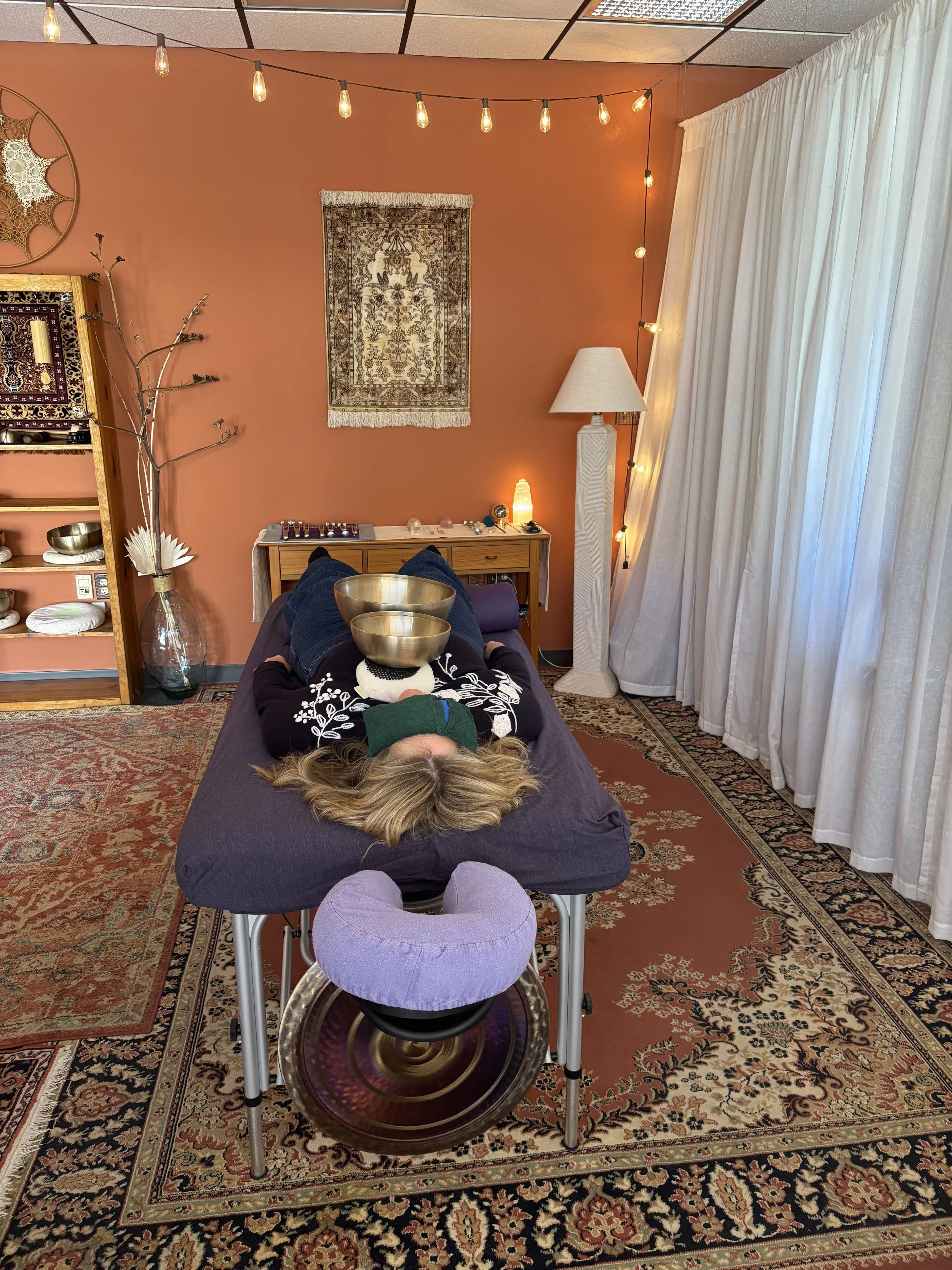 The sessions designed to ease pain (physical & emotional) and re-pattern habitual responses to discomfort. I combine authentic and honest conversation - being seen and witnessed with sound to enhance personal transformation.